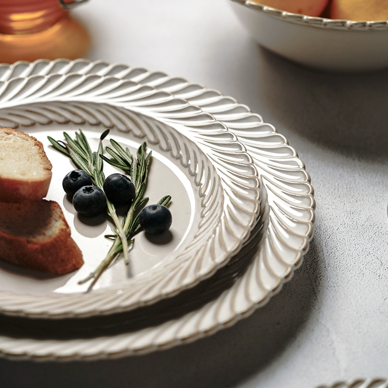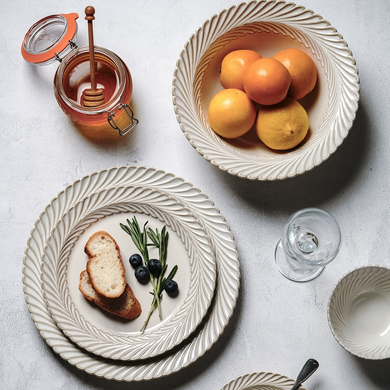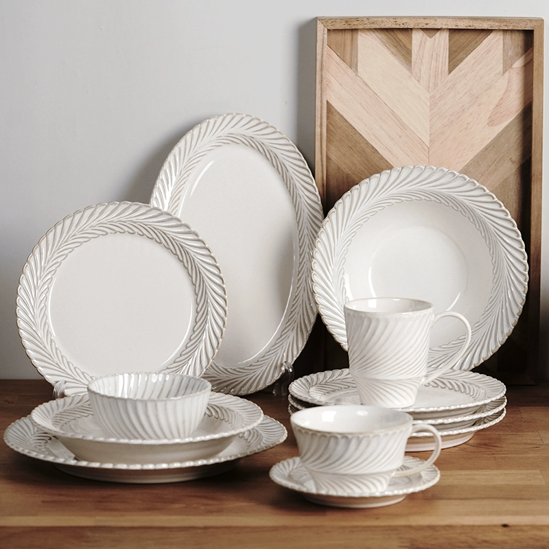 Serve sophistication with the Mimosa Embossed Ceramic Tableware Set – an exquisite ensemble of plates, bowls, and mugs that adds timeless grace to modern Thai homes and luxury cafés.