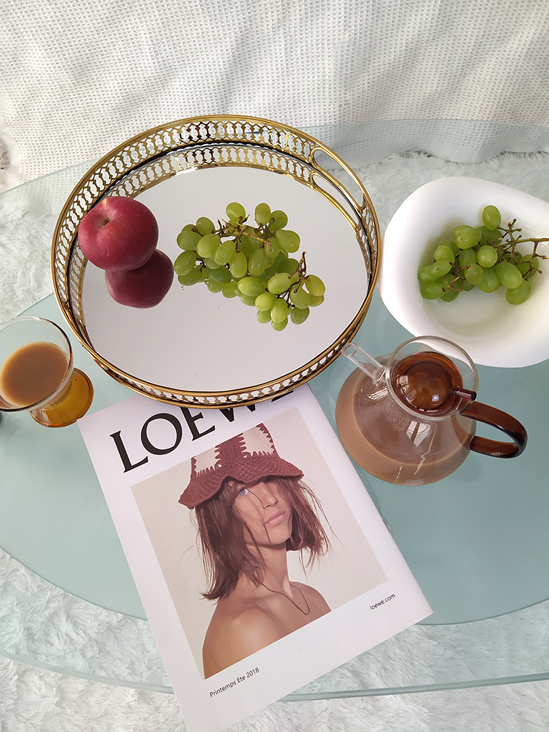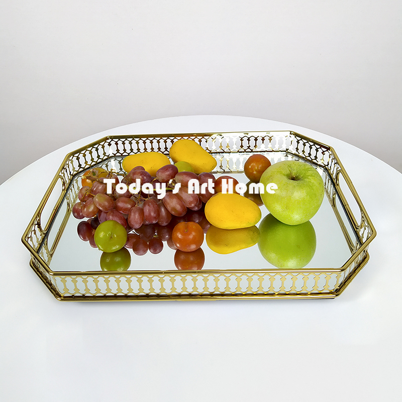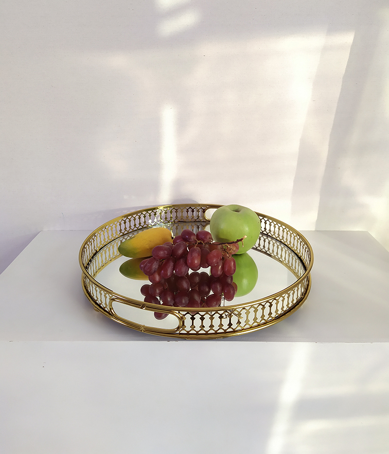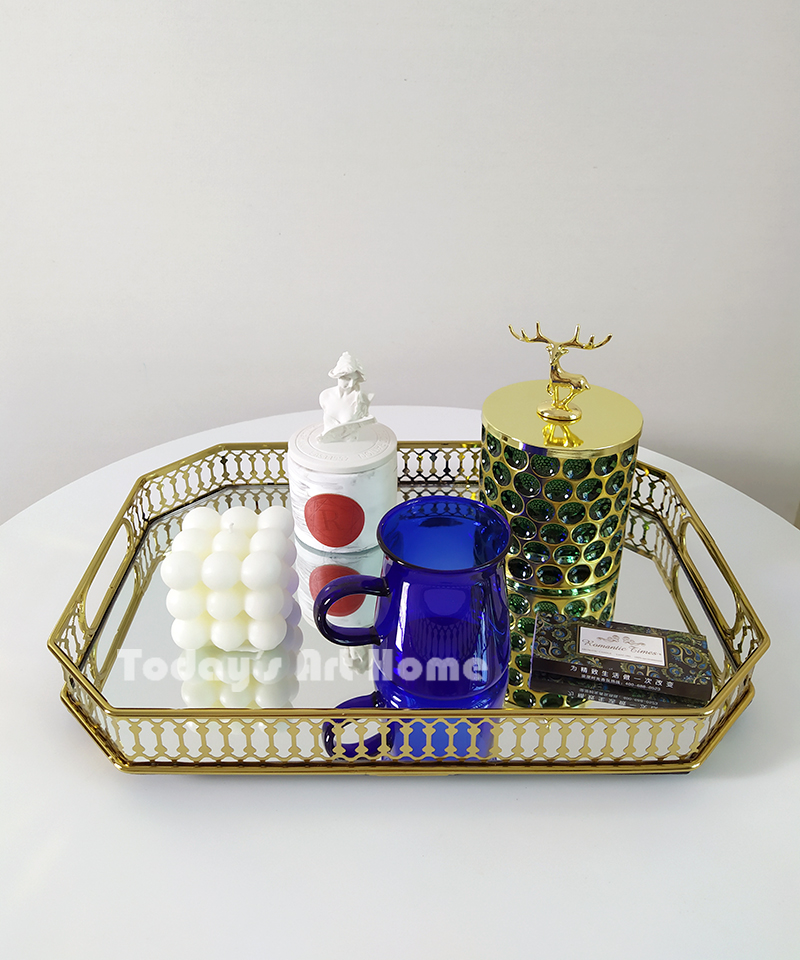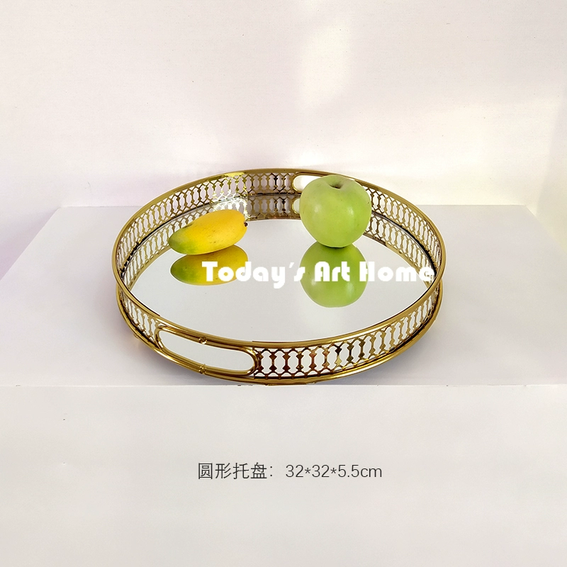 Add a touch of elegance to your table with this Modern Metal Mirror Tray from Today’s Art Home. Crafted from gold-toned iron with a reflective mirror base and intricate openwork frame, this round tray is perfect for serving fruit, displaying candles, organizing décor, or as a stylish tea tray in your living room.