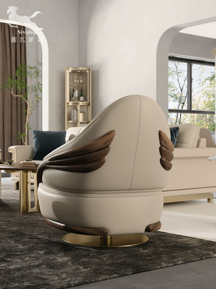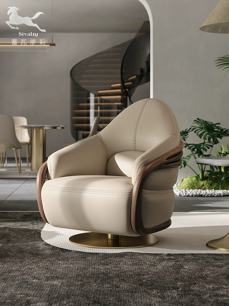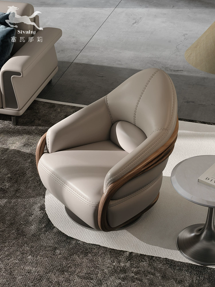 Elevate your Thai home with the Sevanari Leather Swivel Lounge Chair — a designer original that fuses soft curves with modern elegance. Crafted with genuine leather and rich wooden accents, it features a smooth 360° rotating base perfect for stylish comfort in villas, condos, or lounges.